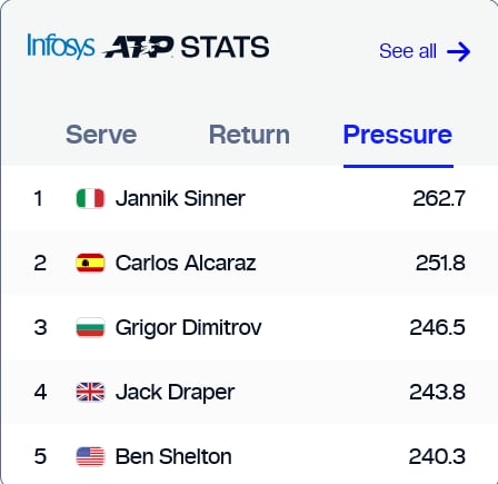 От сайта на ATP водят статистика за най-добрите играчите "под напрежение" и се оказва, че единствено Карлос Алкарас и Яник Синер се намират пред Григор по този показател. Основните показатели, които се гледат са реализираните точки за пробив (процентно), спасените точки за пробив, спечелените тайбреци и съотношението при изиграните финални сетове, а накрая общият резултат се формира от сбора на всички тези компоненти.