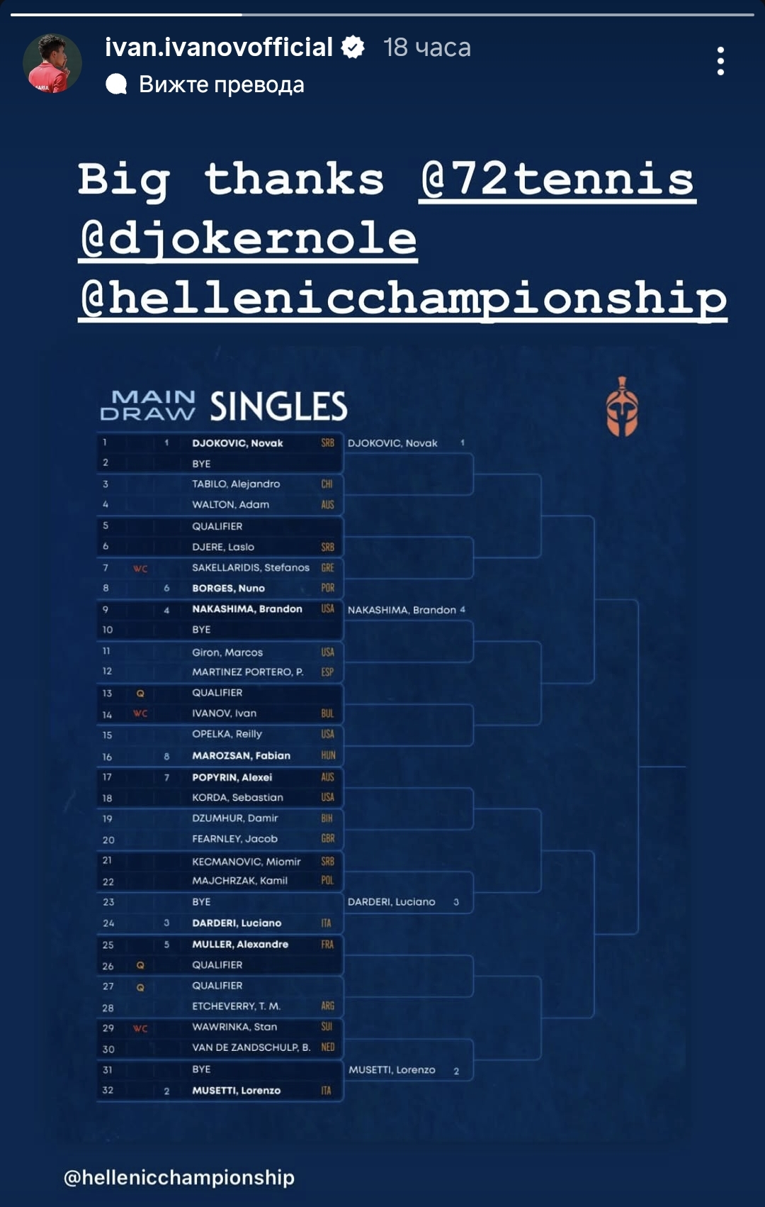 "Големи благодарности към мениджърска агенция "72", организаторите на "Hellenic Championship" и Новак Джокович" - написа световният номер едно при юношите в Instagram, с което показа своята признателност за дадената възможност.