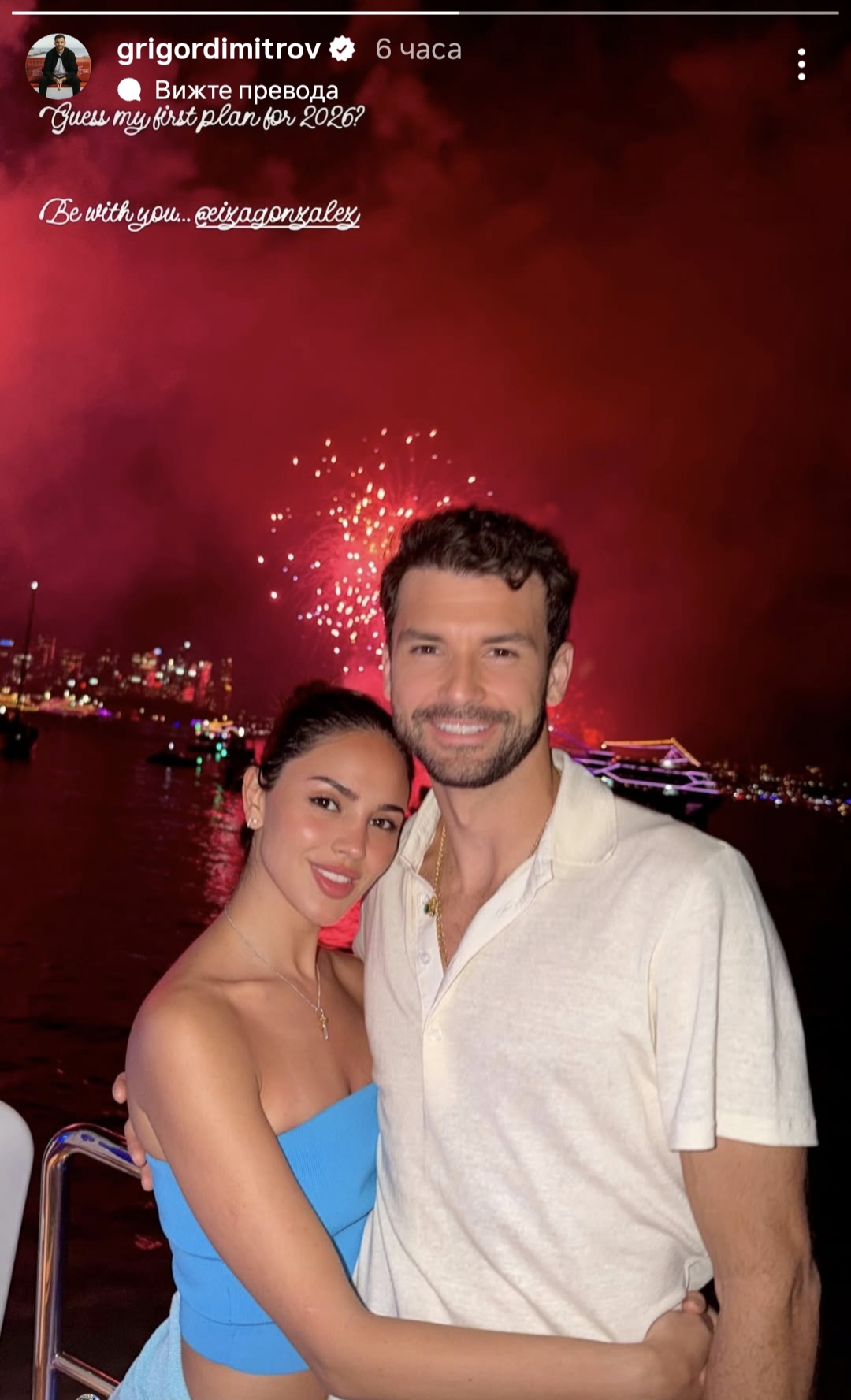 Григор и Ейса нечаквано отскочиха до Сидни, където се насладиха на празничната заря в компанията на общи приятели. Тържествата в австралийския мегаполис винаги са съпътствани от множество ефектни фойерверки, които бяха запечатани чрез телефона на мексиканската красавица, а впоследствие в социалните мрежи се появиха кадри от новогодишния романтичен танц на влюбена двойка, която увековечи момента с целувка.