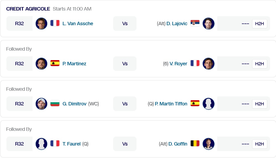 Сблъсъкът между Димитров и Тифон е поставен под №3 в програмата на централния корт и се очаква да стартира някъде след 15:30 часа българско време, като отново ще може да го наблюдавате в реално време чрез линковете на нашия сайт.