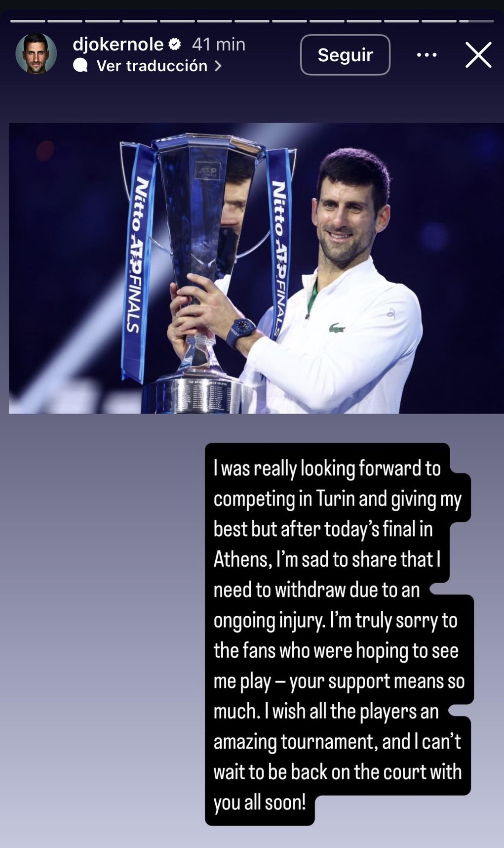 "Наистина очаквах с нетърпение да се състезавам в Торино и да дам най-доброто от себе си, но след днешния финал в Атина, с огромно съжаление споделям, че трябва да се откажа поради контузия. Искрено съжалявам на феновете, които се надяваха да ме видят да играя - вашата подкрепа означава толкова много за мен. Пожелавам на всички играчи невероятен турнир и нямам търпение скоро да се върна на корта с всички вас!" - сподели Джокович в социалните мрежи, с което неговото финално решение стана ясно.